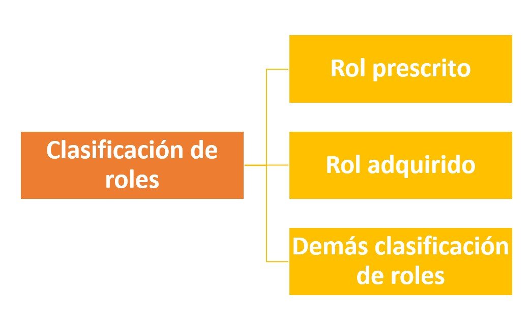Los roles se clasifican conforme a dos categorías genéricas a saber cuáles son los roles prescritos y los roles adquiridos. Como también pueden distinguirse en roles de trabajo, pareja, social, familia e individual.